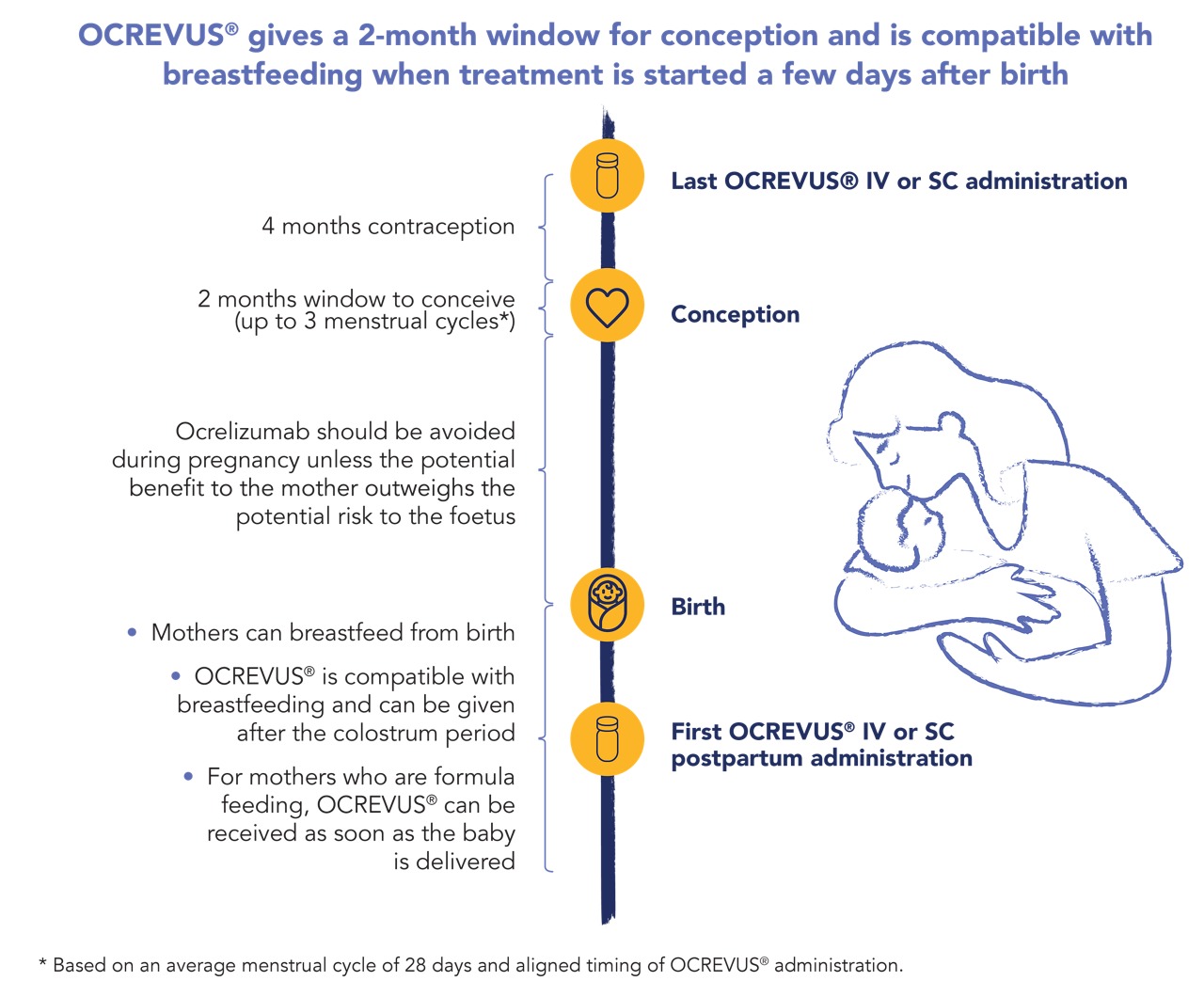 Proactive discussions about family planning and individualised treatment strategies can empower women living with multiple sclerosis to make informed choices. OCREVUS is a high efficacy disease modifying therapy that can be used during breastfeeding thanks to recent data from a phase IV study; with negligible levels of the drug found in breastmilk and undetectable levels in infant serum 30 days after the mother’s first postpartum infusion.