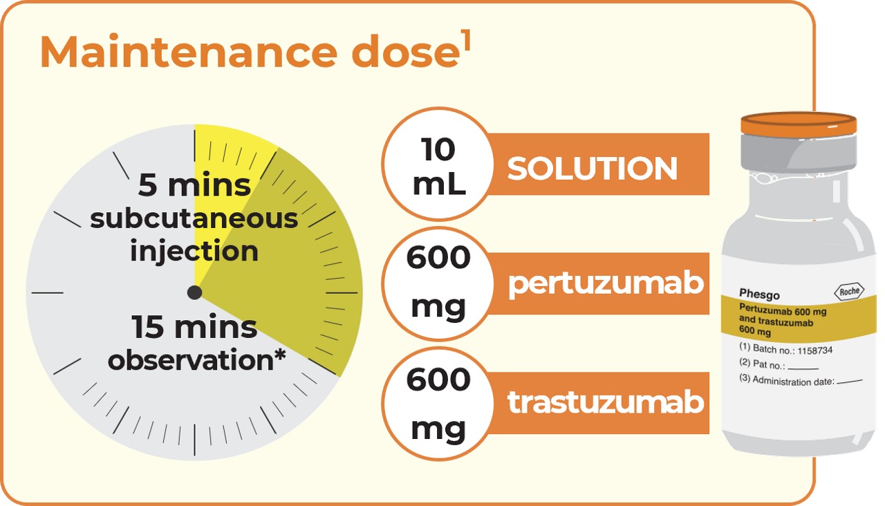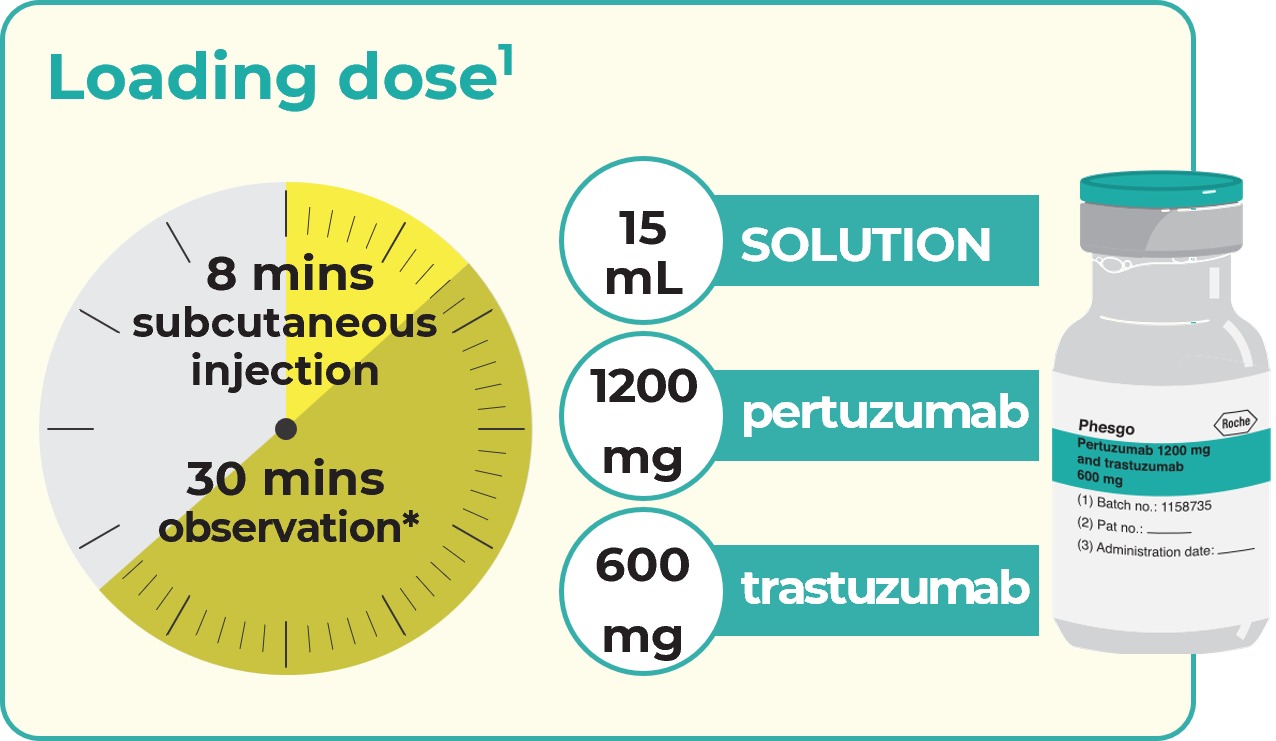 * Patients should be observed for injection-related reactions and hypersensitivity reactions. Observation period should start following administration of PHESGO and be completed prior to any subsequent administration of chemotherapy1