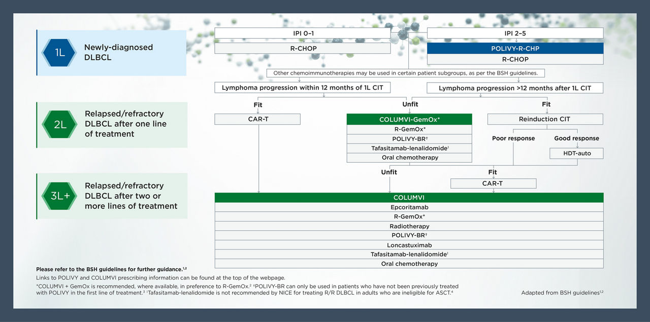 For the full British Society for Haematology guidance on managing large B cell lymphoma, please click here: Newly diagnosed | Relapsed or refractory